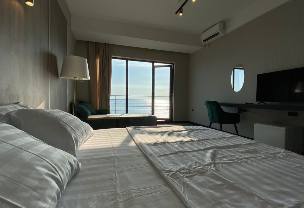 Площадь номера - 30 кв.м. 1 комната. 2 осн. места. вид на море. В номере: телевизор; кондиционер; душ; туалет; фен; сейф; 2-спальная кровать; мини-холодильник. 1 доп. место: